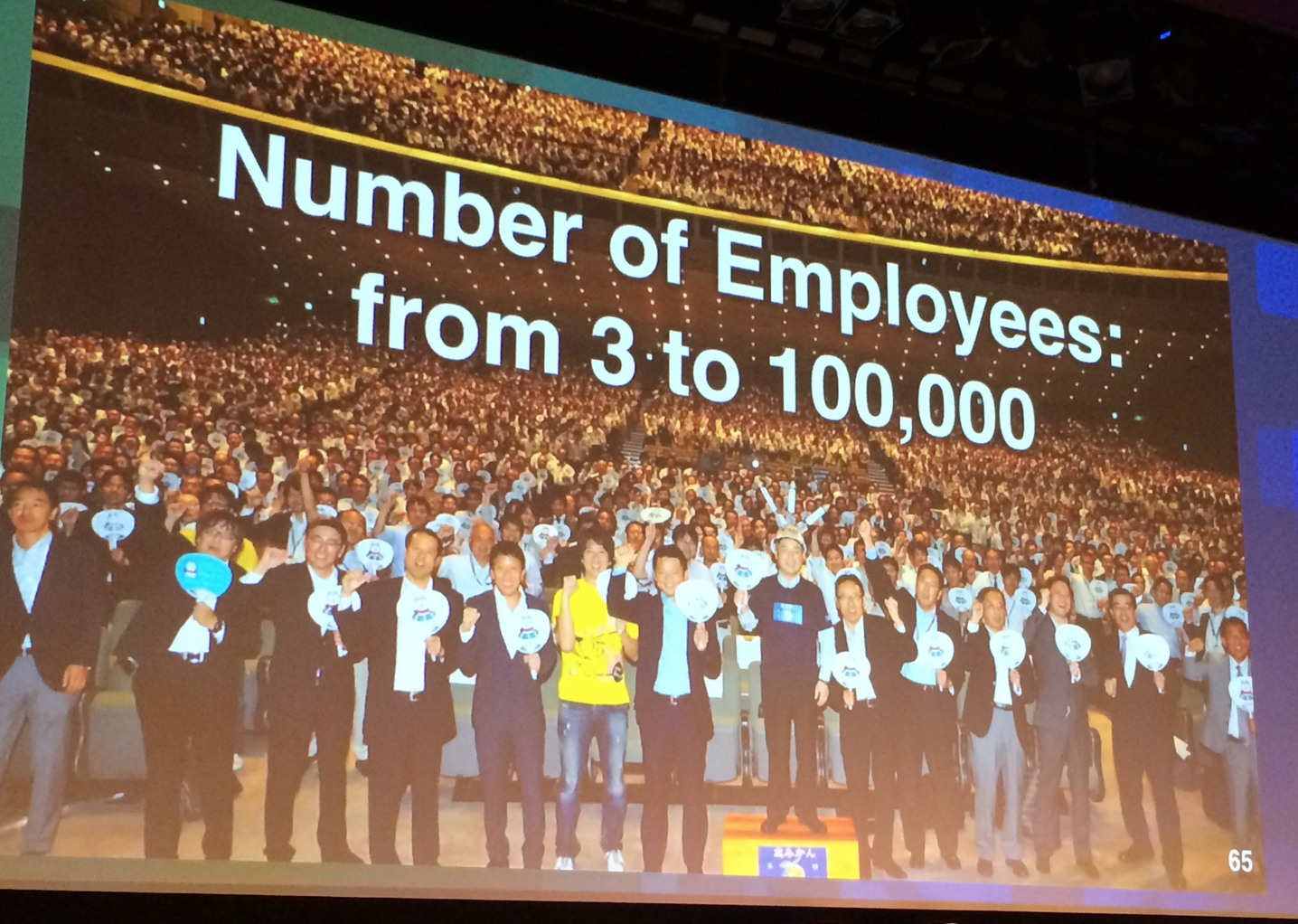 첫번째로 소프트뱅크 본사의 미야우치 켄 부사장이 소프트뱅크의 역사와 비전을 설명하는 키노트스피치를 했다. 그는 손정의사장 다음의 No. 2다. 1981년 손정의사장이 소프트뱅크를 창업하면서 귤상자위에 올라가 2명의 직원앞에서 “장차 10조원매출을 올리는 회사를 만들겠다”고 기염을 토한 얘기부터 시작했다. 이 3명으로 소프트뱅크가 시작됐으며 그 2명의 직원은 그 다음주에 회사를 떠났다고 한다. 🙂