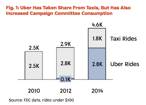 위 그래프는 미국하원의원들과 그 스탭들이 캠페인활동을 위해서 출장을 다닐때 이용한 교통영수증을 분석한 것이다. 2012년에는 약 2천8백건의 택시영수증과 함께 약 100건의 우버사용영수증이 보고되었다. 그런데 2014년에는 택시가 1천8백건으로 감소하고 우버이용이 2천8백건이 된 것이다. 흥미로운 부분은 이런 Ride서비스 이용이 2년사이에 60%가량 늘었다는 점이다. 우버의 편리성에 중독된 사람들이 자신의 차량이나 렌트카를 이용하기 보다 우버를 이용하게 됐을 가능성도 있어 보인다.
