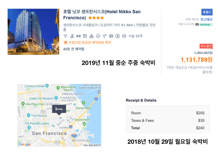 일년전 호텔투나잇으로 1박에 205불(세금제외)를 주고 묵었던 샌프란시스코 닛코 호텔을 지금 검색해보니 1백에 거의 1천불이다. 4~5배 오른 것이다. 여기서 5박을 하면 약 700만원을 내야한다. 5성이 아니라 4성호텔의 일반 객실이다. 이처럼 주중에는 말도 안되는 호텔 가격이 나온다.