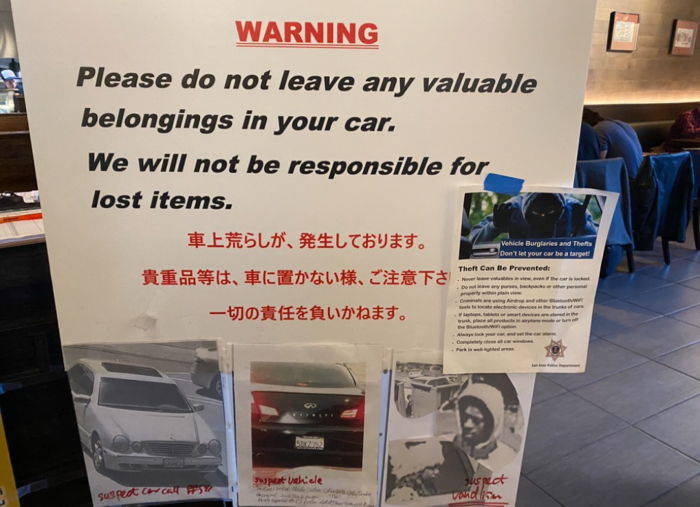 자동차 유리를 깨고 귀중품을 훔쳐 가는 도난 사고도 빈번하다. 카페에서도 갑자기 랩탑컴퓨터를 채가서 훔쳐 가는 도둑이 있으니 조심하라는 경고문이 여기저기 보인다. 억대 연봉을 받는 주민들이 가득한 실리콘밸리의 역설적인 모습이다.