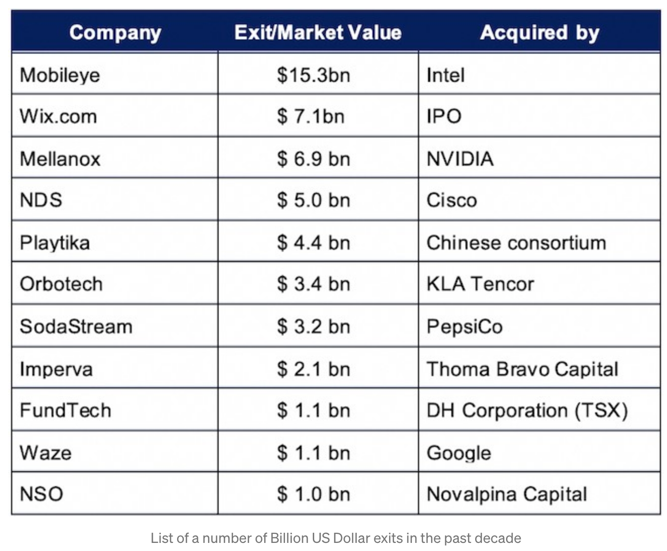 우리는 항상 이스라엘을 스타트업 강국으로 생각합니다. 사실 그렇습니다. 이스라엘에는 어마어마한 스타트업들이 많습니다. 인텔이 15B(16조)을 주고 인수한 모빌아이부터 나스닥에 상장해 7B(8조)이상 가치의 테크회사가 된 wix.com 등 대단한 회사가 많습니다. 지난 10년간 큰 성과를 낸 이스라엘 스타트업들을 소개하는 이 표를 보면 우리가 모르는 조단위 엑싯을 한 이스라엘 스타트업들이 꽤 많다는 것을 알 수 있습니다.