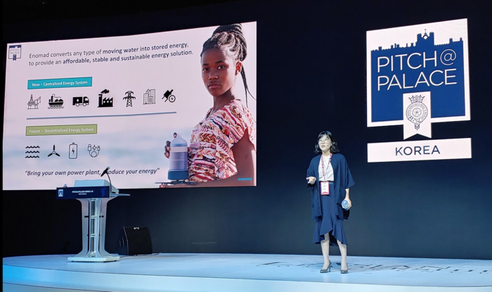 첫발표는 이노마드의 박혜린 대표. 물병 크기의 휴대용 수력발전기를 선보였다.