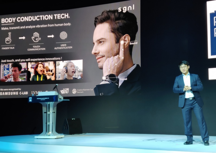 웨어러블 시계줄을 차고 손가락으로 귀를 만지는 것만으로도 통화가 가능한 제품, 시그널을 선보인 이놈들연구소 최현철 대표.