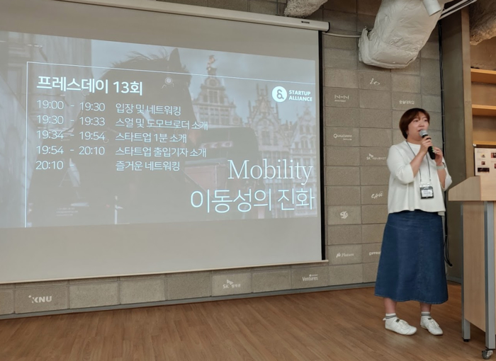 스얼은 홍보대행사인 도모브로더와 제휴해서 분기별로 한번씩 프레스데이를 갖는다. 특정분야의 스타트업 대표, 홍보담당자들과 다양한 매체들의 기자들이 만나서 자유롭게 교류할 수 있도록 하는 모임이다. 지난 2월20일 에듀테크 프레스데이에 이어 5월30일에는 모빌리티 프레스데이를 개최했다. 행사 PM을 맡은 신나리팀장이 첫 인사말을 했다.
