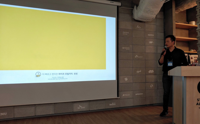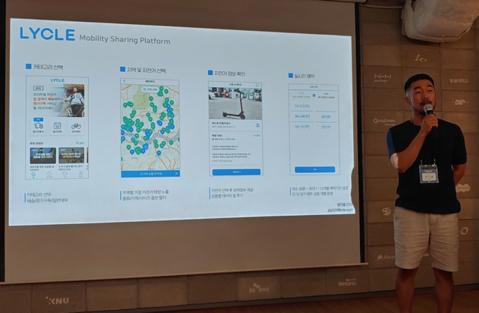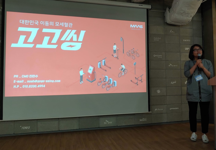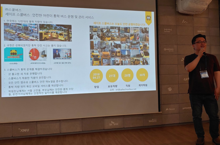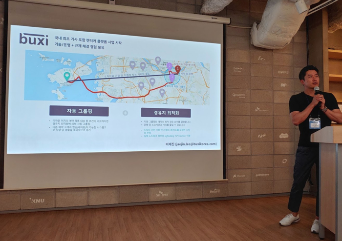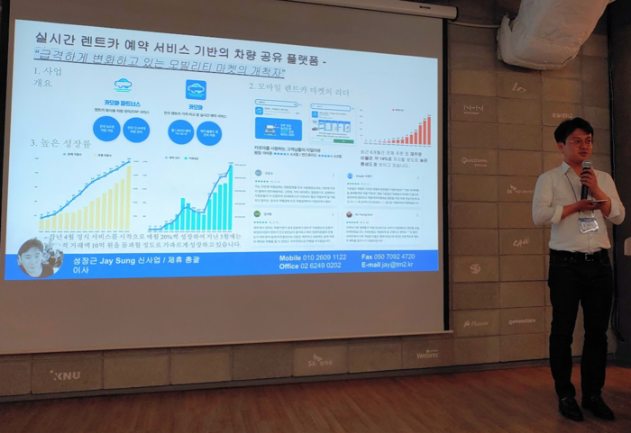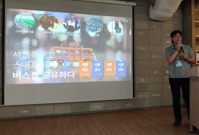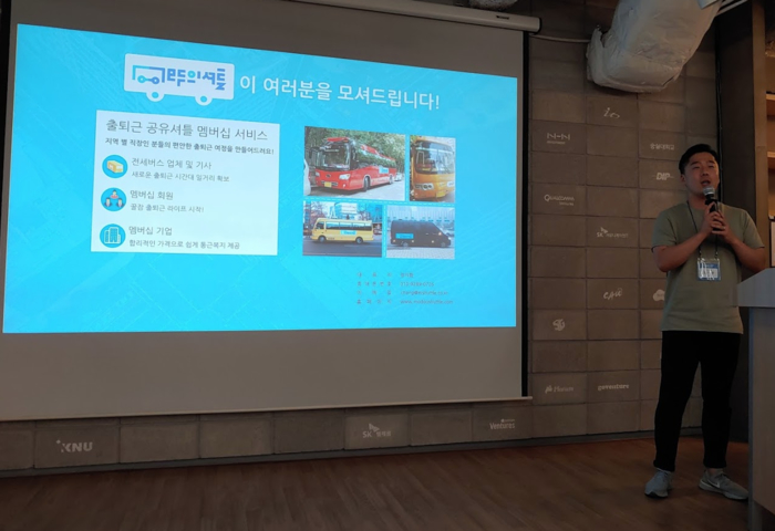 출퇴근 공유셔틀 멤버십 서비스를 제공하는 모두의 셔틀 장지환 대표의 발표. 대중교통이 잘 연결되지 않는 애매한 루트로 출퇴근하는 직장인들에게 큰 인기가 있는 서비스.