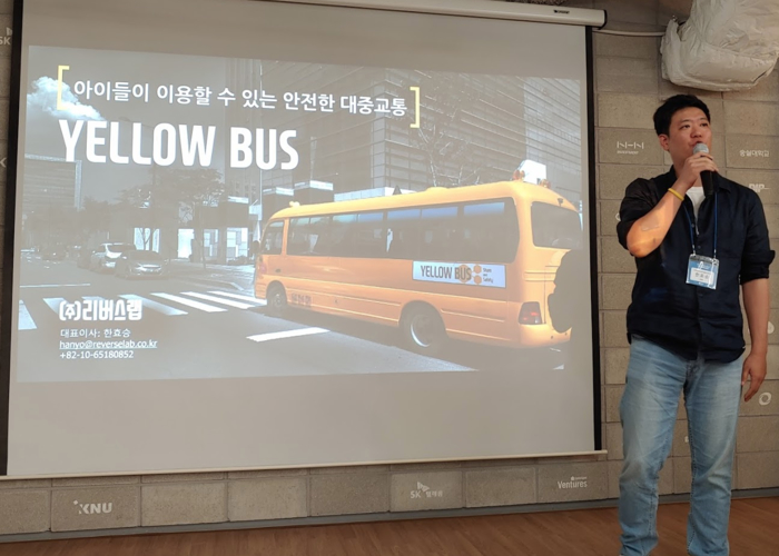 아이들을 위한 셔틀버스 공유서비스 옐로우버스를 제공하는 리버스랩 한효승 대표. 학원버스 O2O서비스다.