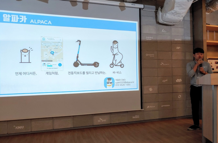 대전 카이스트 캠퍼스에서 공유 전동 킥보드 서비스를 제공하는 알파카 석용우 CMO. 공유킥보드서비스에 게임요소를 집어 넣어서 즐겁게 탈 수 있도록 한다고.