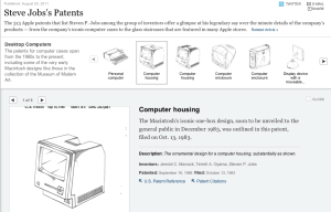 읽어보면 역시 권위지답게 뉴욕타임즈와 월스트리트저널의 기사들이 돋보인다. 그냥 여기저기 퍼져있는 내용을 짜깁기 해서 내보내는 것이 아니라 스티브 잡스에 대해서 새로운 앵글에서 조명한 기사를 소개한다. Steve Jobs’s Patents라는 스티브잡스가 이름을 올린 313개의 애플특허를 소개한 NYT의 인터렉티브기사가 대표적인 예이다.