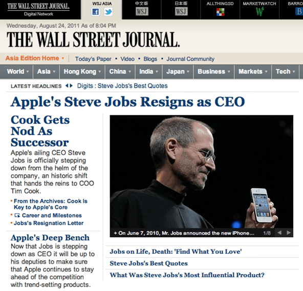 스티브 잡스의 애플의 CEO사임소식에 그야말로 미국이 난리다. 동부시간으로 어제 오후 늦게 발표된 그의 사임소식후 블룸버그는 2시간 넘게 특집방송을 내보내고 거의 모든 뉴스사이트가 1면톱으로 이 뉴스를 다뤘다.
