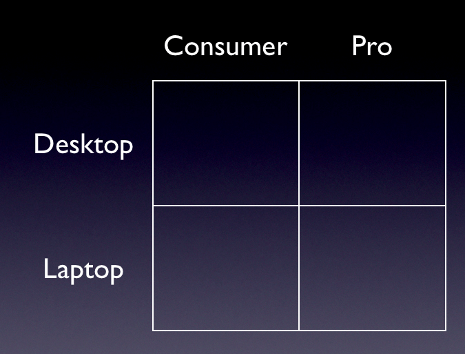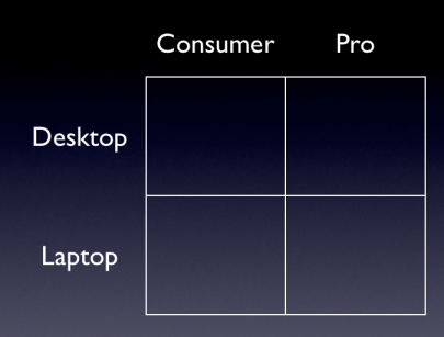이렇게 몇주간 브리핑을 받던 잡스는 “이제 그만”하고 외쳤다. 그는 화이트보드에 4개의 사각형이 있는 도표를 그리고 가로줄에는 일반인, 프로페셔널, 그리고 세로줄에는 데스크탑, 랩탑이라고 썼다. 그런다음 “우리는 이 각각의 사각형에 맞는 4개의 훌륭한 제품만 있으면 된다”고 선언했다. 그뒤부터 애플직원들은 이 핵심 4가지 영역에만 모든 역량을 집중하게 된다. 잡스는 그밖의 것들은 무자비하게 다 없애버렸다. 당시 프린터라든지, 서버 등도 만들었었는데 없애버렸고 뉴튼이라는 혁신적인 PDA도 단종시켰다.