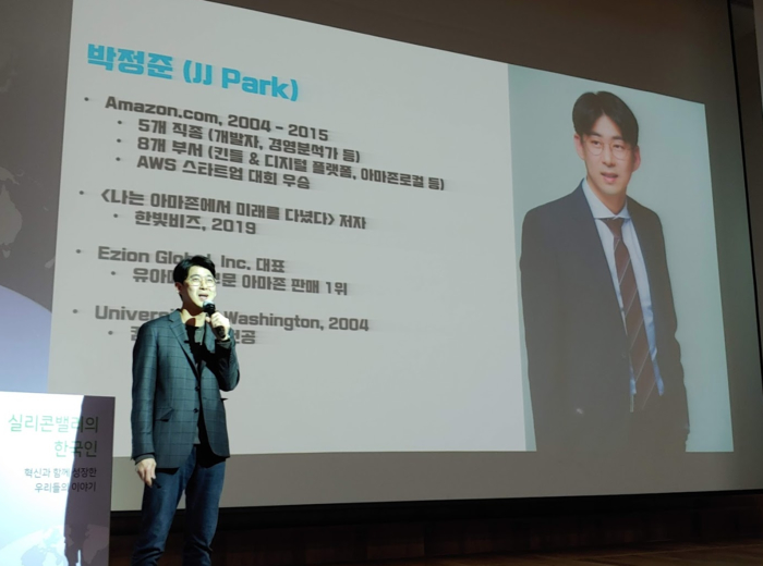마지막 발표는 박정준 이지온 글로벌 대표입니다. 아마존의 시애틀 본사에서 2004년부터 2015년까지 무려 12년을 근무하며 아마존이 하나의 스타트업에서 세계 1위의 기업으로 성장하는 과정을 가장 가까이서 목격하고 경험했습니다. 8개 부서와 5개 직종을 거쳤다고 합니다. 그는 그 경험을 담은 최근에 <나는 아마존에서 미래를 다녔다>를 최근에 출간했습니다. 그래서 발표 제목도 ‘아마존이 내게 준 것들’입니다. 정준님이 아마존에서 배우고 경험한 내용을 진솔하게 전해주실 예정입니다.