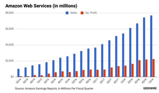AWS의 가파른 성장률을 보여주는 그래프다. 2018년의 AWS매출은 25억6천6백만불로 한화로 거의 30조원에 육박했다. 그리고 올해 매출 전망은 40조원이 넘는다.