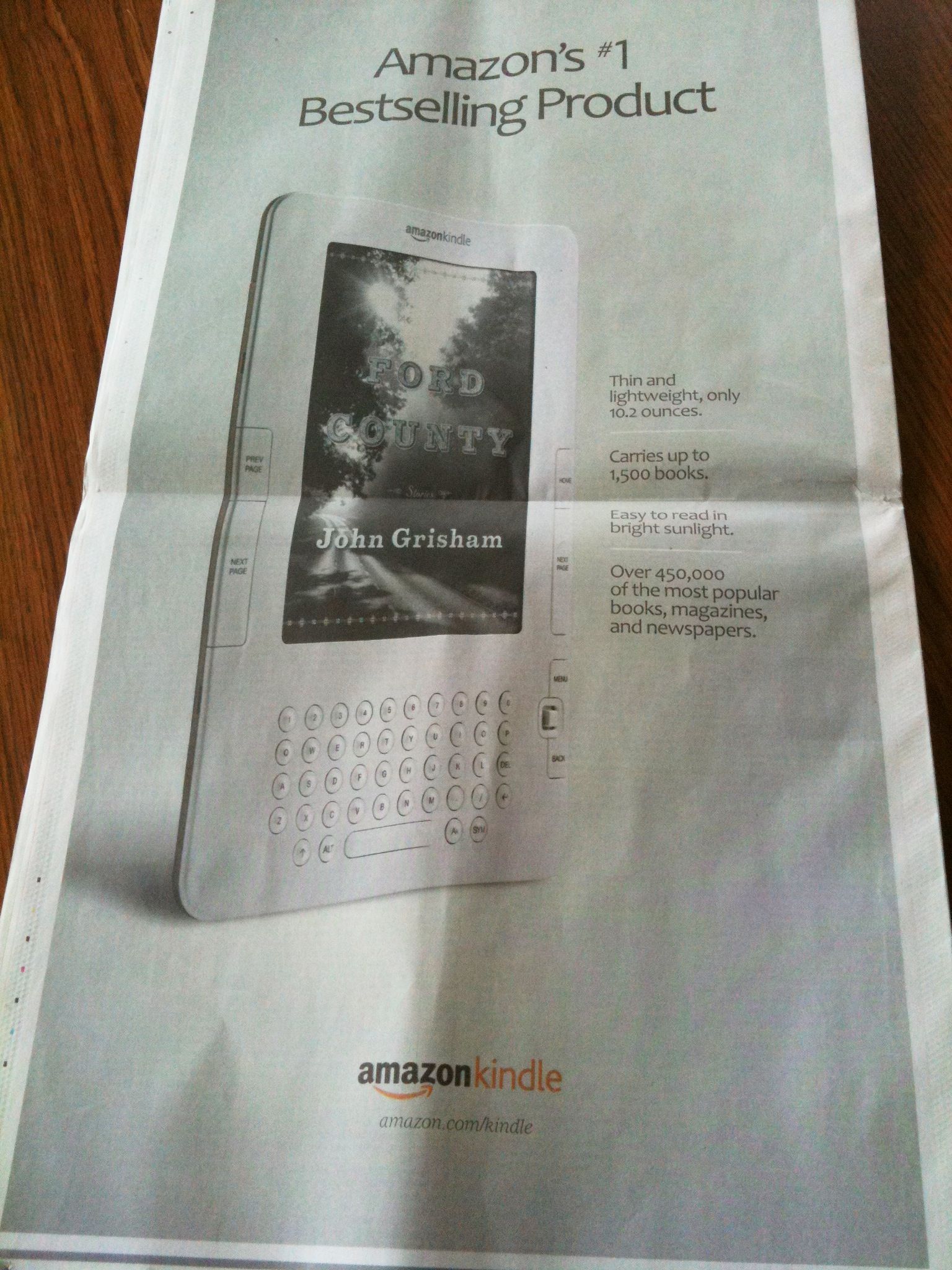 그리고 위 광고 킨들에 등장한 타이틀은 베스트셀러작가 존 그리샴의 최신작 ‘Ford County’다. 이 작품은 나온지 몇달안된 신간. 그동안 전자책을 내놓기 꺼려왔던 존 그리샴은 3월중순 드디어 전자책으로 자신의 작품들을 제공하겠다고 선언했었다. 그런데 존그리샴의 작품은 아직 iBooks에는 없고 아마존킨들에서만 구할 수 있다.