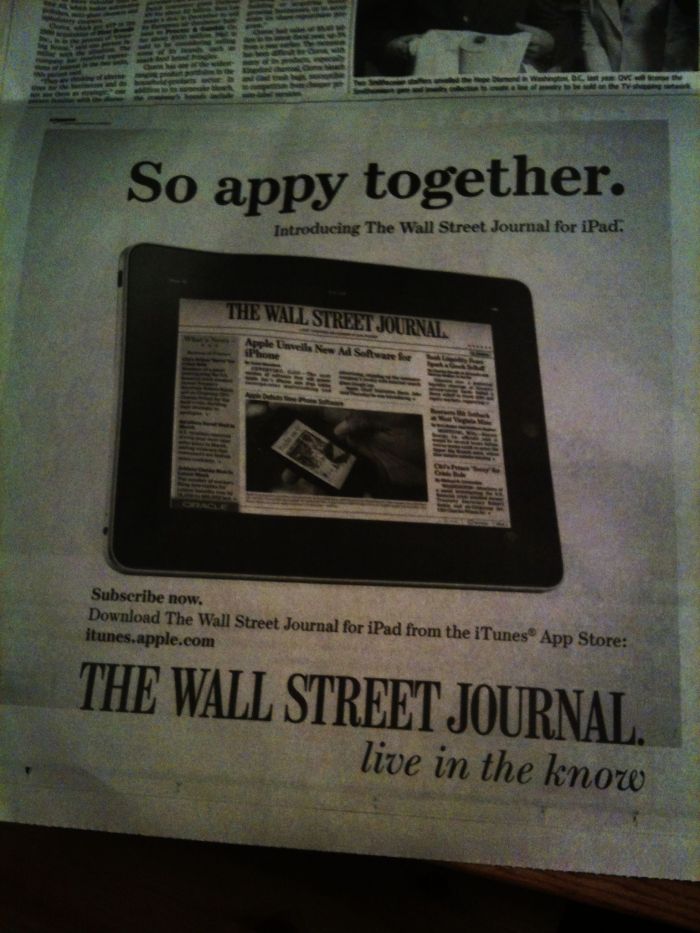 지난 포스팅에서 월스트리트저널을 도배하다시피한 아이패드의 영향력에 대해서 쓴 일이 있다. 그것이 월요일자였는데 일주일동안 월스트리트저널은 WSJ 아이패드광고를 끊임없이 내보냈다. 얼마나 뉴스콥(WSJ의 모회사)가 아이패드에 기대를 걸고 있는지 알 수 있다. 오늘은 전면광고는 안나오고 반면광고로 또 나왔다.