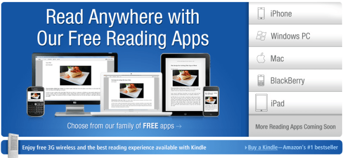 흥미롭게도 아마존처럼 ‘Read anywhere’라는 문구를 사용했다. 조만간 애플도 iBooks for Mac, iBooks for PC 등을 발표할지 모른다.