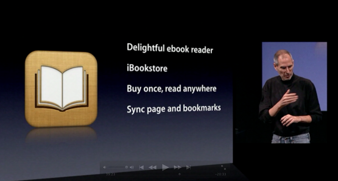 그런데 애플도 바보가 아니다. 무게나 태양광아래서의 약점은 아이패드의 다른 무수한 장점으로 덮을 수 있다. 부족한 책구색은 출판사와의 협상을 통해서 점차 개선되어 나갈 것이다. 당장 iBooks앱의 완성도는 킨들아이패드앱보다 더 낫다는 평가다. 다만 전자책을 구입하고 아이패드에서만 읽을 수 있다는 것이 큰 약점으로 생각됐다. 그런데!