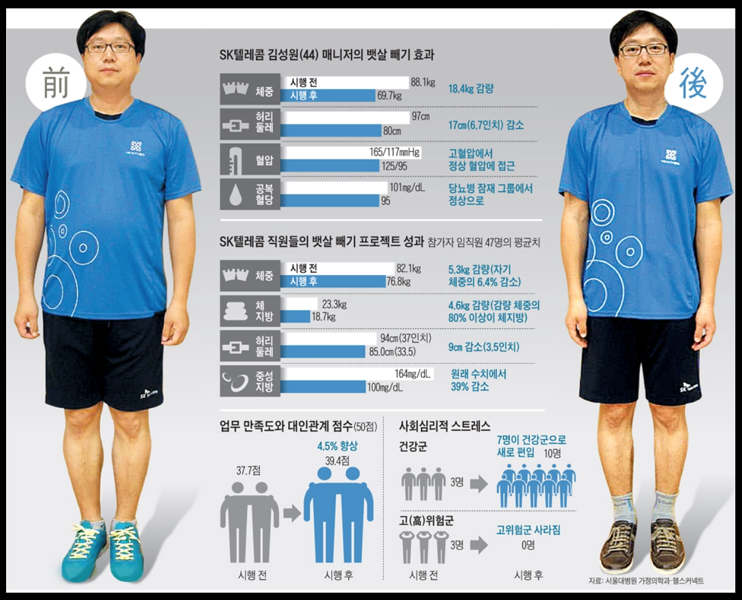 마침 흥미롭게도 1월7일자 조선일보에 “배불뚝이 직장인 47명, 12週 걷기… 허리 9㎝ 줄어 업무효율 크게 향상”라는 기사가 실렸다. “체중을 엄청나게 줄였다”는 부분을 빼고는 지하철을 타면서 하루에 2만보를 걷고 모바일앱을 이용해 신체활동을 측정해가며 동기부여를 했다는 점이 비슷하다.