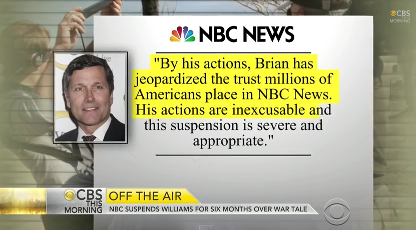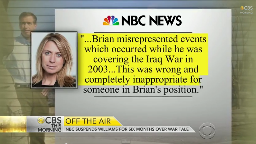 이 내용을 바탕으로 성조지가 기사를 썼다. 브라이언 월리암스는 버틸 수가 없었다. 바로 방송에서 자신이 실수한 것이라고 사과했지만 사태는 일파만파 번져갔다. 그리고 NBC방송은 그의 6개월 정직을 오늘 발표했다.