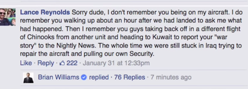그는 지난주에 무공훈장을 받은 군인을 소개하는 뉴스꼭지에서 2003년 당시 상황을 다시 언급했다. 자신이 그 헬기에 타고 있었던 것처럼 말한 것이다. 그러자 당시 그 헬기를 조종했던 군인들이 페이스북에 댓글을 남겼다! 거짓말하지 말라고.