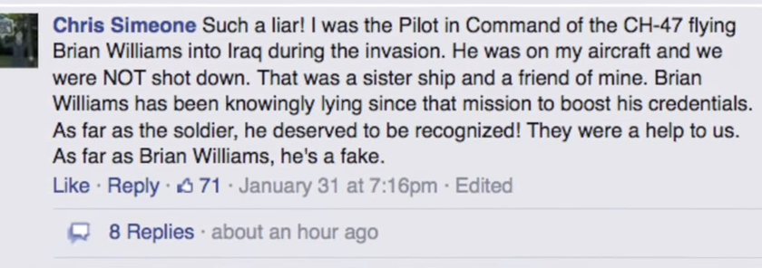 이것은 브라이언 월리암스를 실제로 태우고 갔던 헬기조종사가 쓴 댓글이다. “거짓말장이!”라면서 당시 상황을 묘사하고 있다.