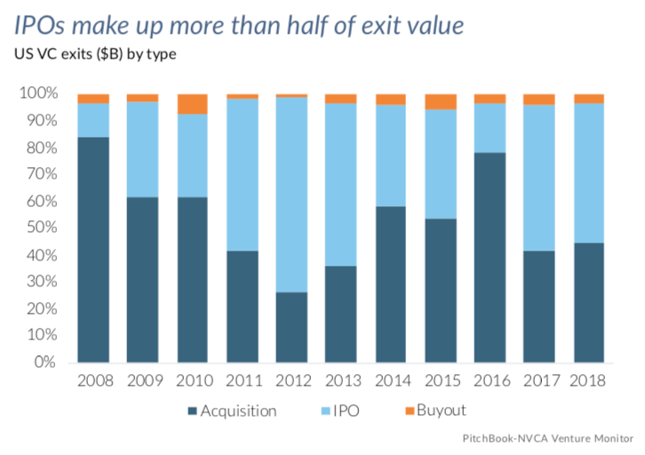 지난 10년간 25개의 큰 엑싯이 나온 나라들의 비중이다. 당연히 미국이 압도적이지만 중국도 만만치 않다. 아쉬운 것은 그 밖의 나라는 보여주지 않는 점이다.