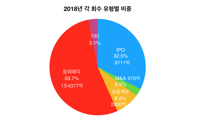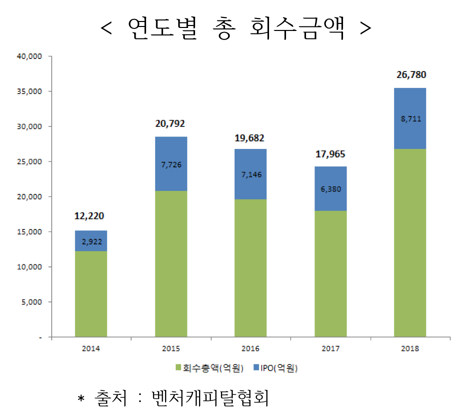 한국의 VC들은 2018년 총 1,328개사로부터 26,780억원을 회수했다. 역대 최고치다. 벤처투자 원금 대비 약 2.1배의 수익배수를 달성했다.