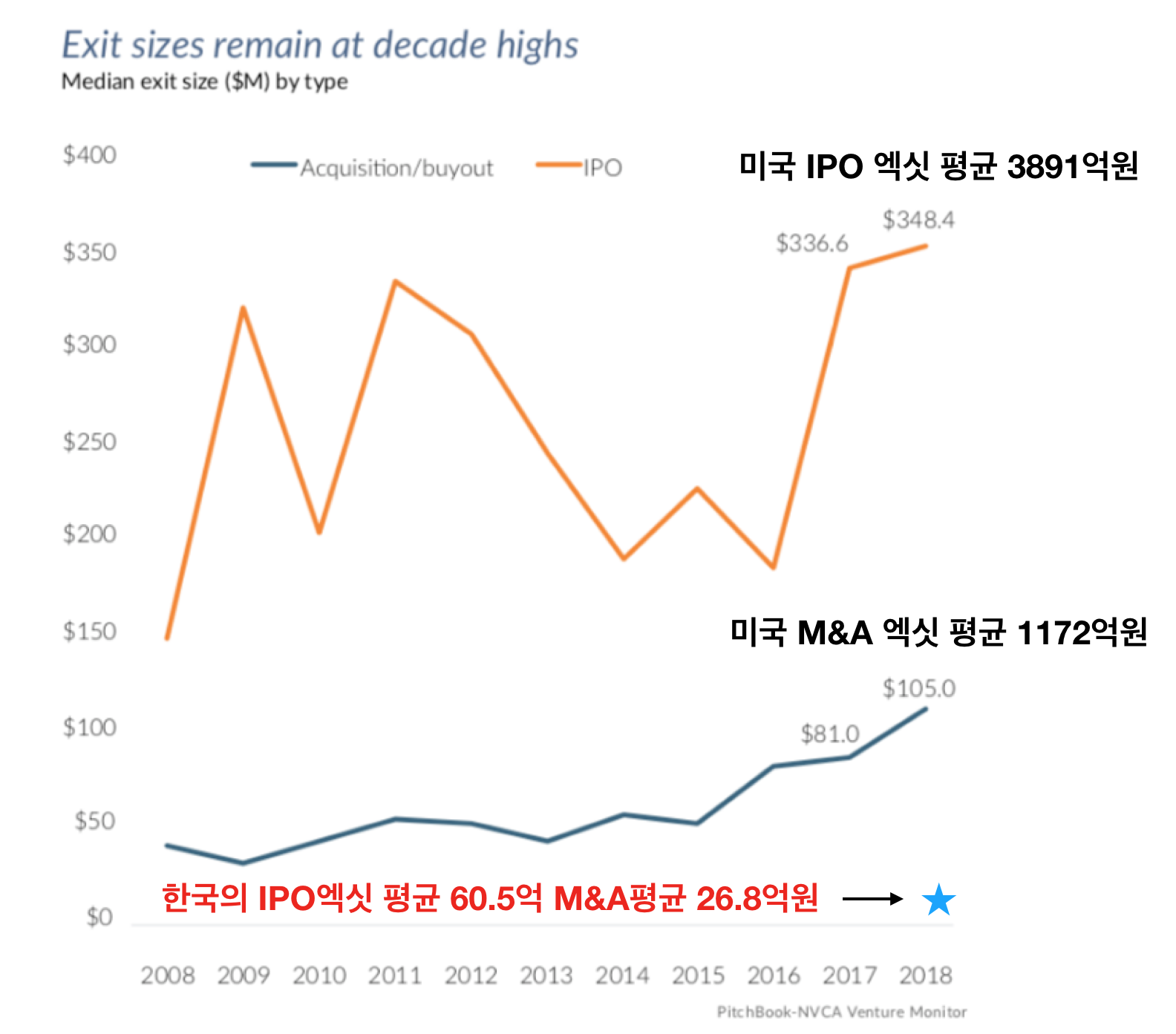 어쨌든 이렇게 데이터를 비교해 보니 한국의 스타트업생태계를 활성화시키기 위해서 가장 시급한 문제가 엑싯규모를 늘리는 것이라는 생각이 들었다. 평균 엑싯사이즈를 지금의 적어도 몇배는 늘려야 스타트업투자가 민간 자본을 끌어들일 정도로 매력적으로 보일 것이다.
