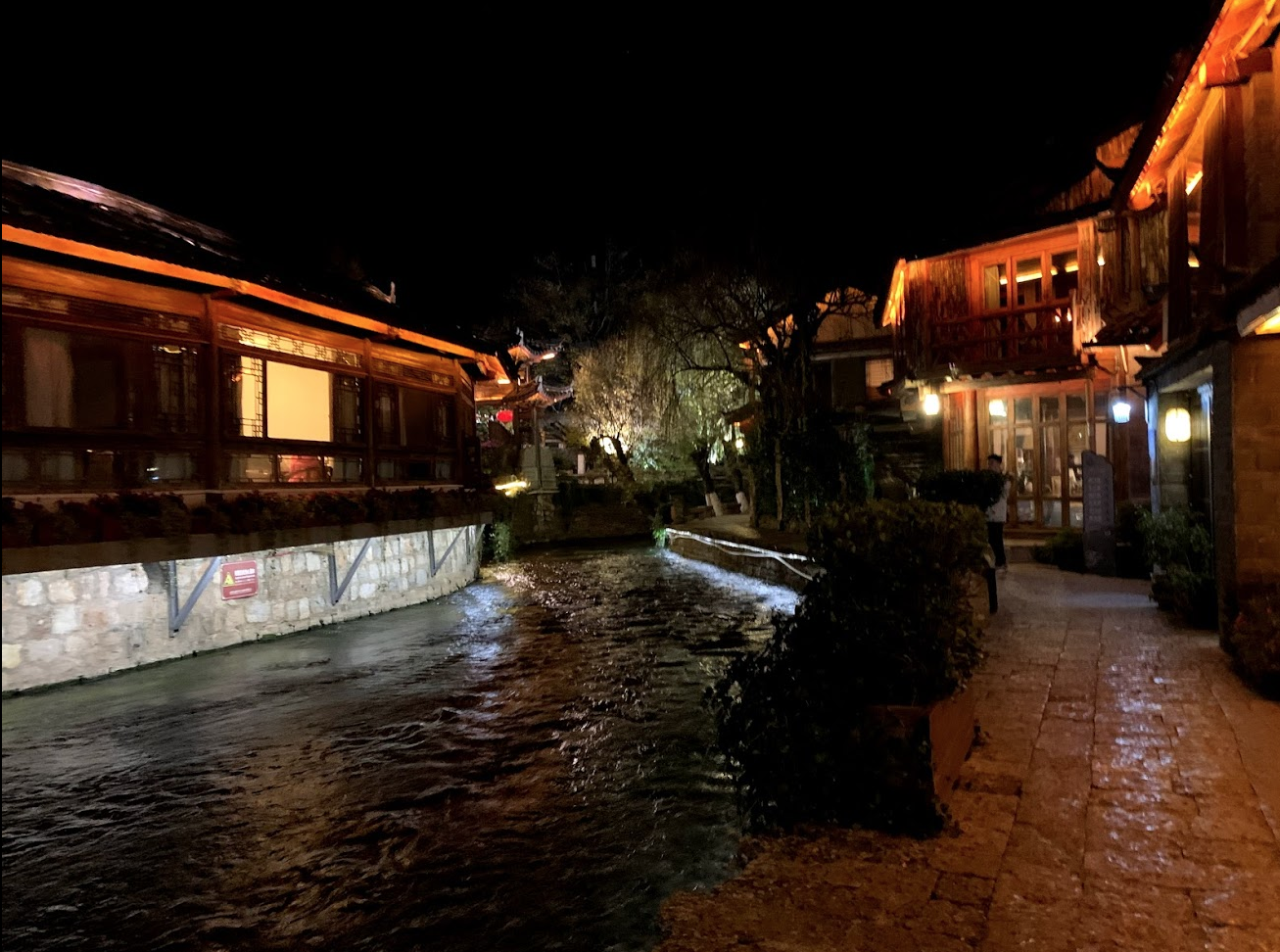 저녁에 다시 고성에서 밤산책. 리장고성은 어디나 크고 작은 실개천이 흐르고 있다. 그런데 놀랍게도 물도 아주 깨끗하다. 캘리포니아날씨와 햇살인데 캘리포니아와 달리 깨끗한 물이 풍부한 축복받은 곳이라는 생각이 들었다.