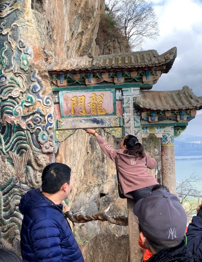 용문을 만난다. 용문아래 튀어나온 부분을 만지면 재수가 좋다고 해서 다들 저렇게 만지고 지나간다.