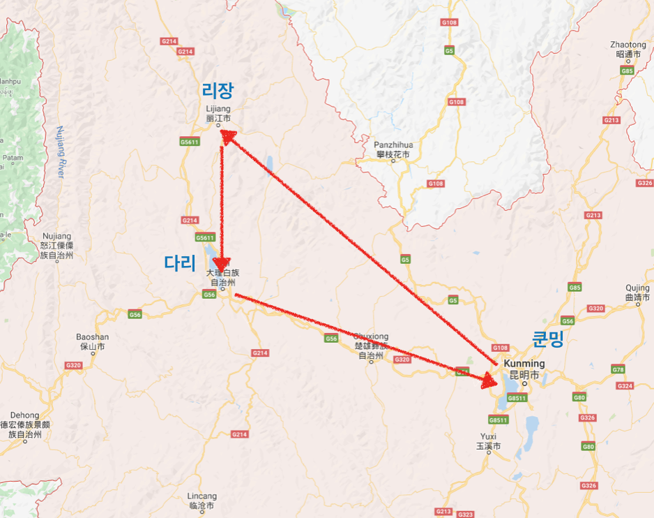 쿤밍으로 들어가서 리장, 다리를 거쳐 다시 쿤밍으로 돌아왔다.