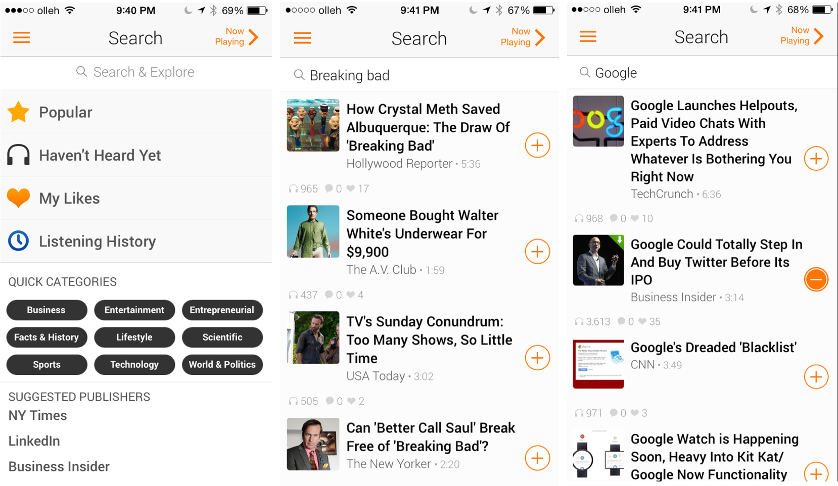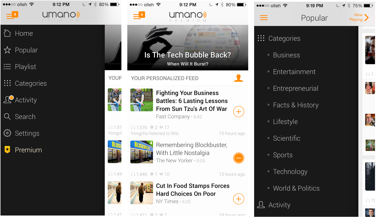 일단 비즈니스, 엔터테인먼트 등 다양한 뉴스카테고리의 기사가 있다. 뉴스소스는 NYT, 뉴요커, 패스트컴퍼니 등 주로 신문과 잡지, 블로그다. 특히 창업-건강-테크관련 기사가 많이 올라오는 것이 특징이다. 기사 리스트에서 +버튼을 누르면 그 기사가 플레이리스트로 들어간다. 우마노에서 골라서 성우가 직접 읽은 기사가 하루에 약 70개가량 올라온다. 짧으면 1~2분, 길면 7~8분정도의 기사들이다.