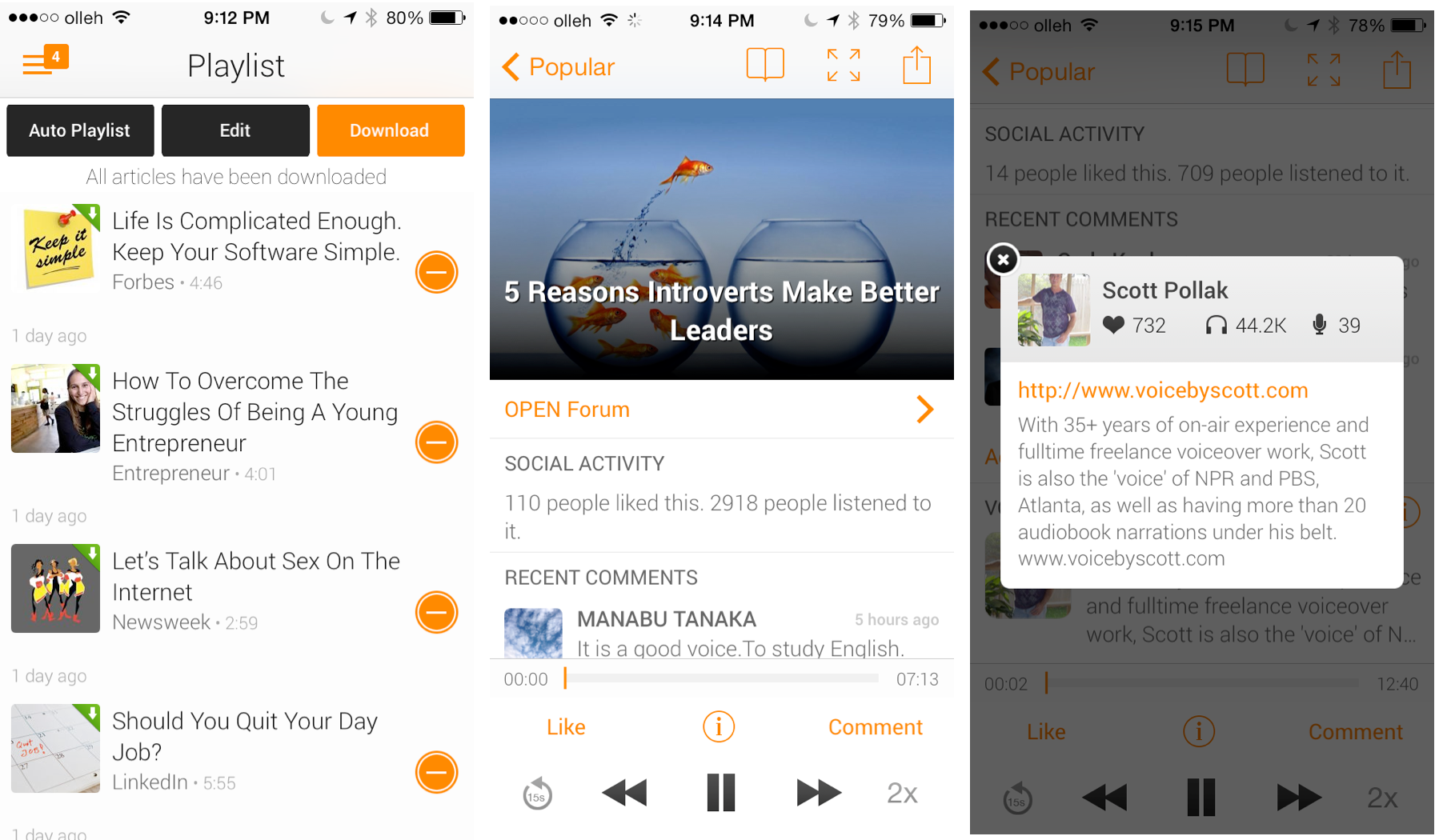 플레이리스트에 들어간 기사들은 wifi상태에서 다운로드받았다가 오프라인상태에서도 들을 수 있다. (월 4불짜리 프리미엄버전에서만 되는지도 모르겠다.) 듣고 싶은 기사를 플레이리스트에 골라두었다가 들으면 좋다. 각 기사는 어떤 성우가 읽었는지가 나온다. 성우입장에서는 자신을 홍보하는 도구로 사용할 수도 있는 셈이다.