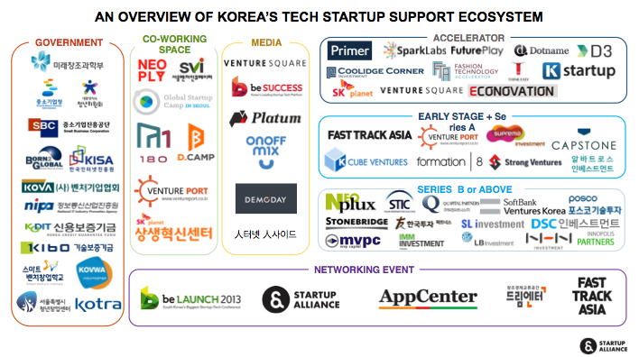 그럼 한국의 스타트업 생태계는 어떨까요. 한국만큼 정부가 나서서 열심히 창업자들을 지원해주는 곳은 없는 것 같습니다. 각 부처, 지자체별로 많은 창업지원프로그램이 있습니다. 또 스타트업얼라이언스, 디캠프, 마루180, 드림엔터, 미래글로벌창업지원센터같은 창업자들이 모일 수 있는 공간이 속속 생기고 있고 많은 스타트업 관련 모임들이 활발히 열리고 있습니다. 혹자는 너무 과열이 아닌가 하는 우려를 합니다.