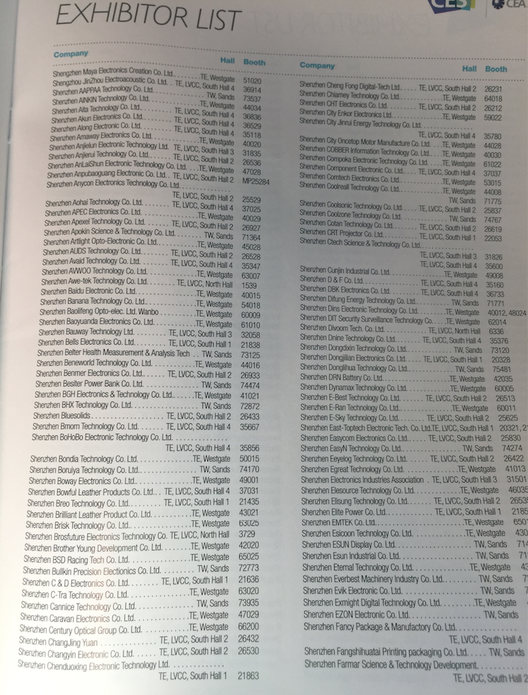 구글을 다니다 나와서 50여 스타트업에 엔젤투자를 한 미국친구와 CES에서 우연히 만나서 이야기할 기회가 있었다. 우리는 서로 “심천이 대단하다”는 말을 서로 했다. 아니 얼마나 많은 중국회사들이 CES에 온 것이냐며 놀랐다는 얘기다. ‘Shenzhen’이라는 이름이 들어간 중국회사를 수십개는 본 것 같다는 얘기를 하자 그 친구가 말했다. “CES공식디렉토리를 보면 Shenzhen회사가 4페이지를 차지한다.” 찾아보니 정말 그랬다.