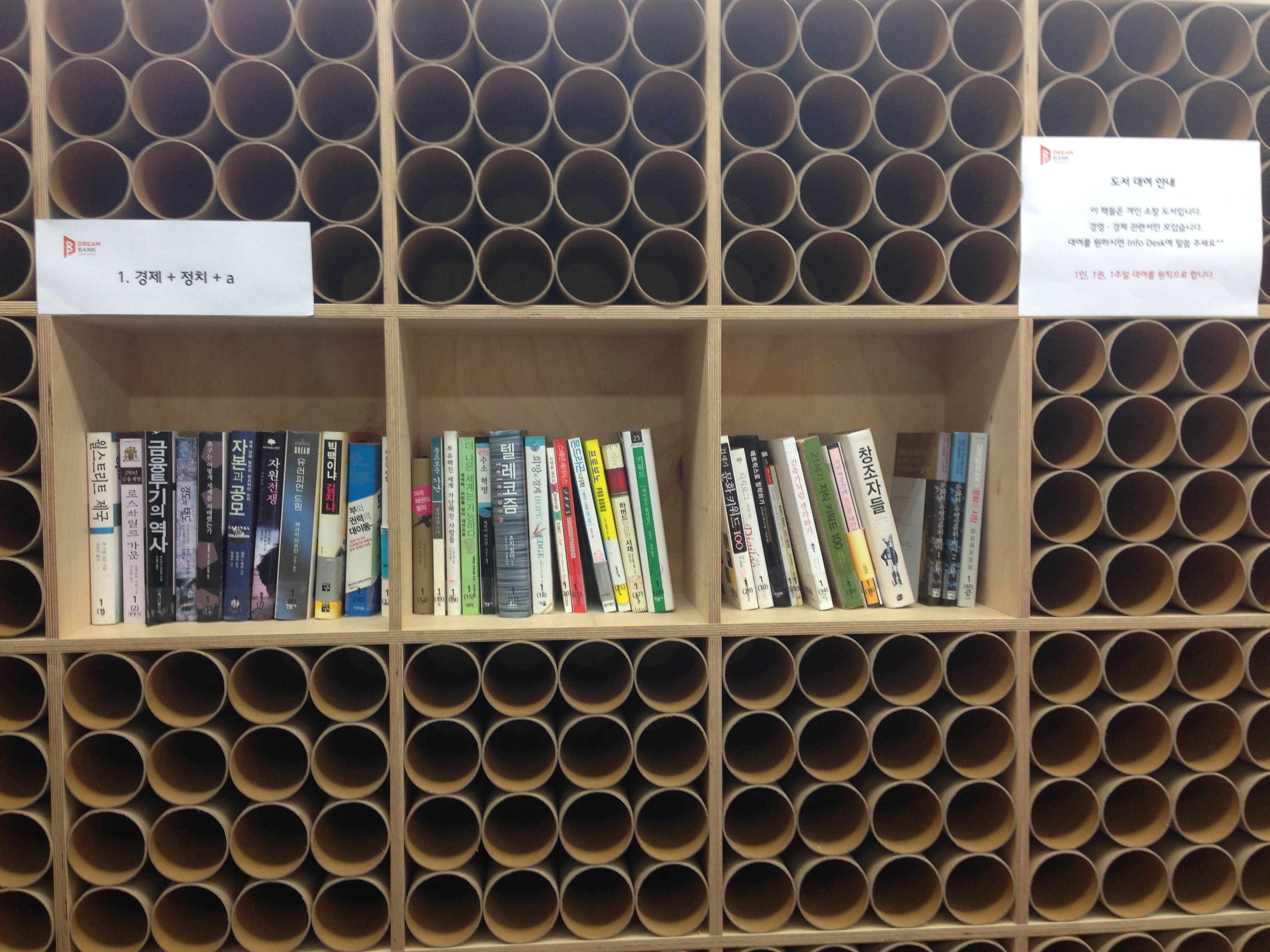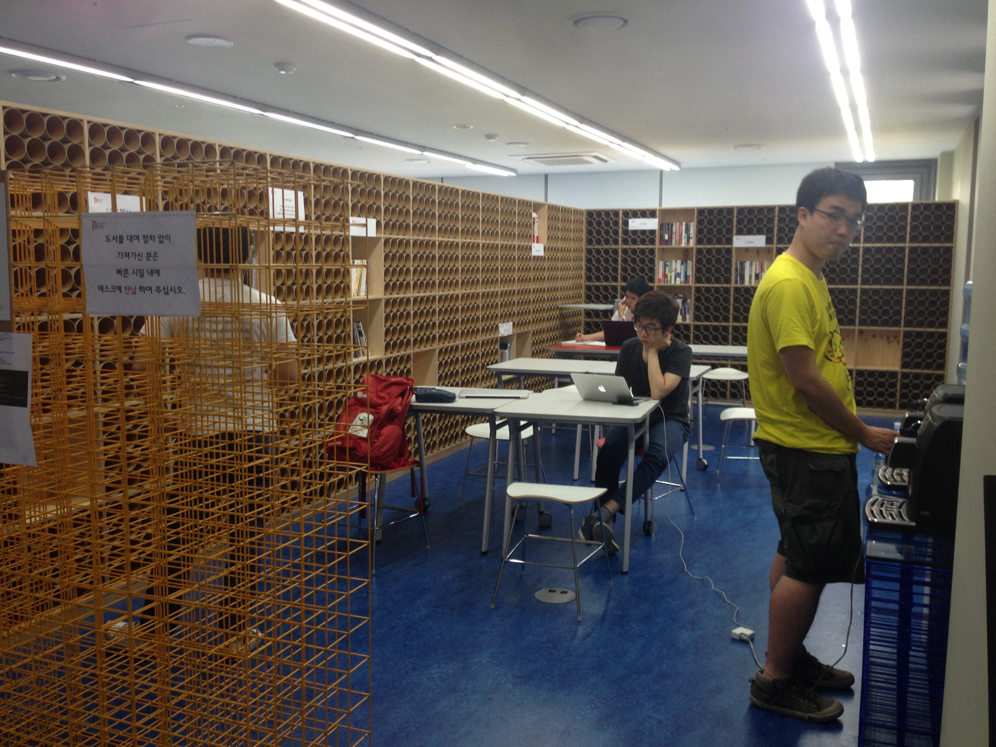 아직 책은 많지 않지만 도서관도 있다. 이제 책을 채워넣는 중이다. 재미있는 것은 거의 돈을 안들이고 값싼 소재를 이용해서 인테리어를 했다는 점이다. 그런데도 깔끔하고 멋있어 보인다.