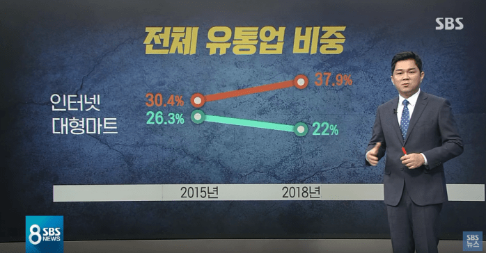 SBS는 그래서 한때 공룡으로 전통시장, 자영업자들을 집어삼킬 것 같았던 대형마트가 위기라고 전한다. 2012년부터 7년 연속으로 성장이 마이너스라는 것이다.