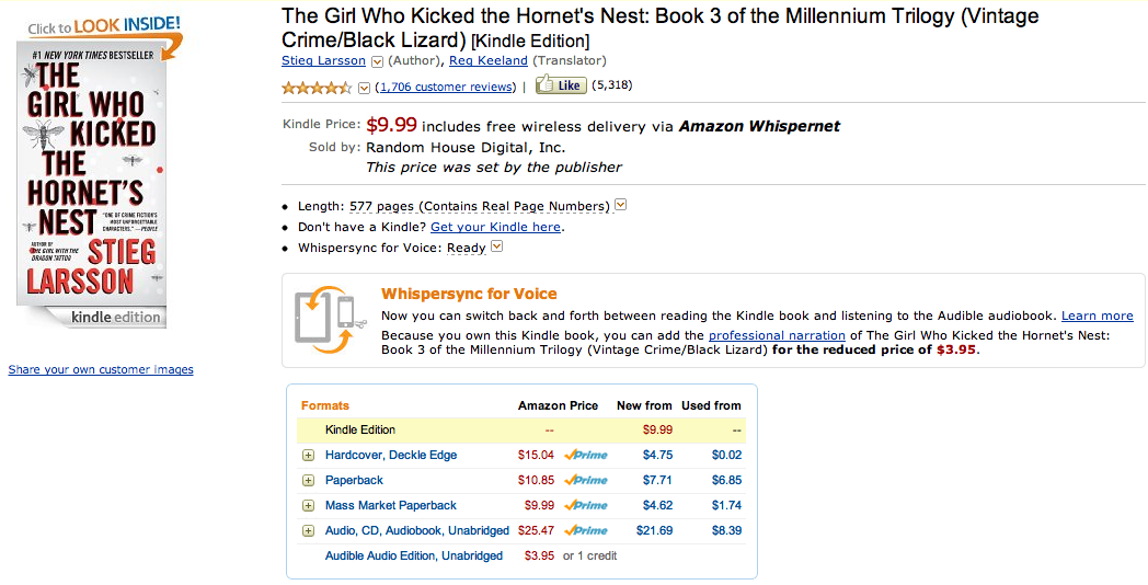 스티그 라르손의 밀레니엄시리즈 3부의 경우 킨들북을 구입한 뒤에 오디오북을 추가하면 $3.95에 구매할 수 있다고 되어 있다.