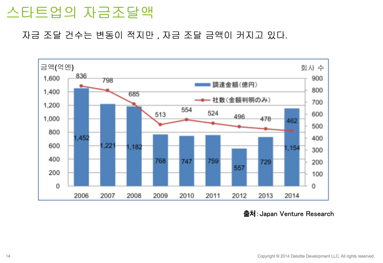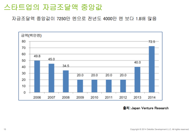 어쨌든 그런 이유로 해서 소수의 좋은 일본스타트업은 몸값이 급격히 올라가고 있다. 스타트업별 평균 투자금액은 2006년의 5천만엔에 비해 2014년은 7천2백만엔으로 휠씬 높아졌다.