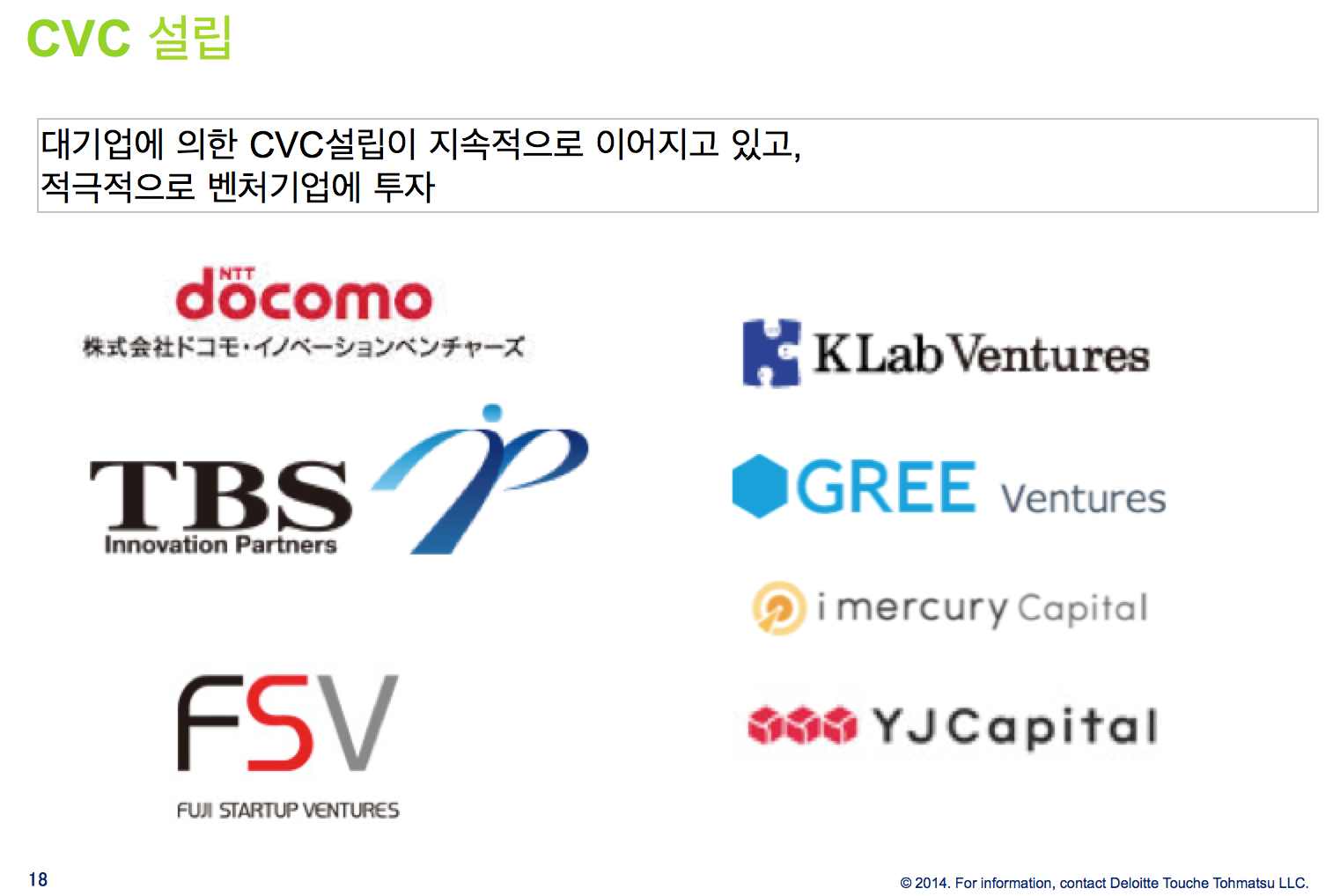 이런 일본의 스타트업 열기속에서 주목할만한 것은 대기업의 CVC설립이 늘어나고 있다는 것이다. CVC는 Corporate Venture Capital의 약자로 대기업이 스타트업투자를 목적으로 만든 벤처펀드를 말한다. 야후재팬 같은 인터넷기업이 YJ캐피탈이란 약 2천억원규모의 벤처캐피털을 만들어서 모바일스타트업에 투자하는 것이 대표적인 예다. 흥미로운 점은 이런 추세가 인터넷기업에 그치지 않는다는 것이다. NTT도코모, KDDI 같은 이동통신회사와 니콘, 오므론 같은 제조업체 그리고 심지어는 후지TV, 도쿄방송같은 미디어까지 CVC를 만들고 스타트업투자에 나서고 있다.