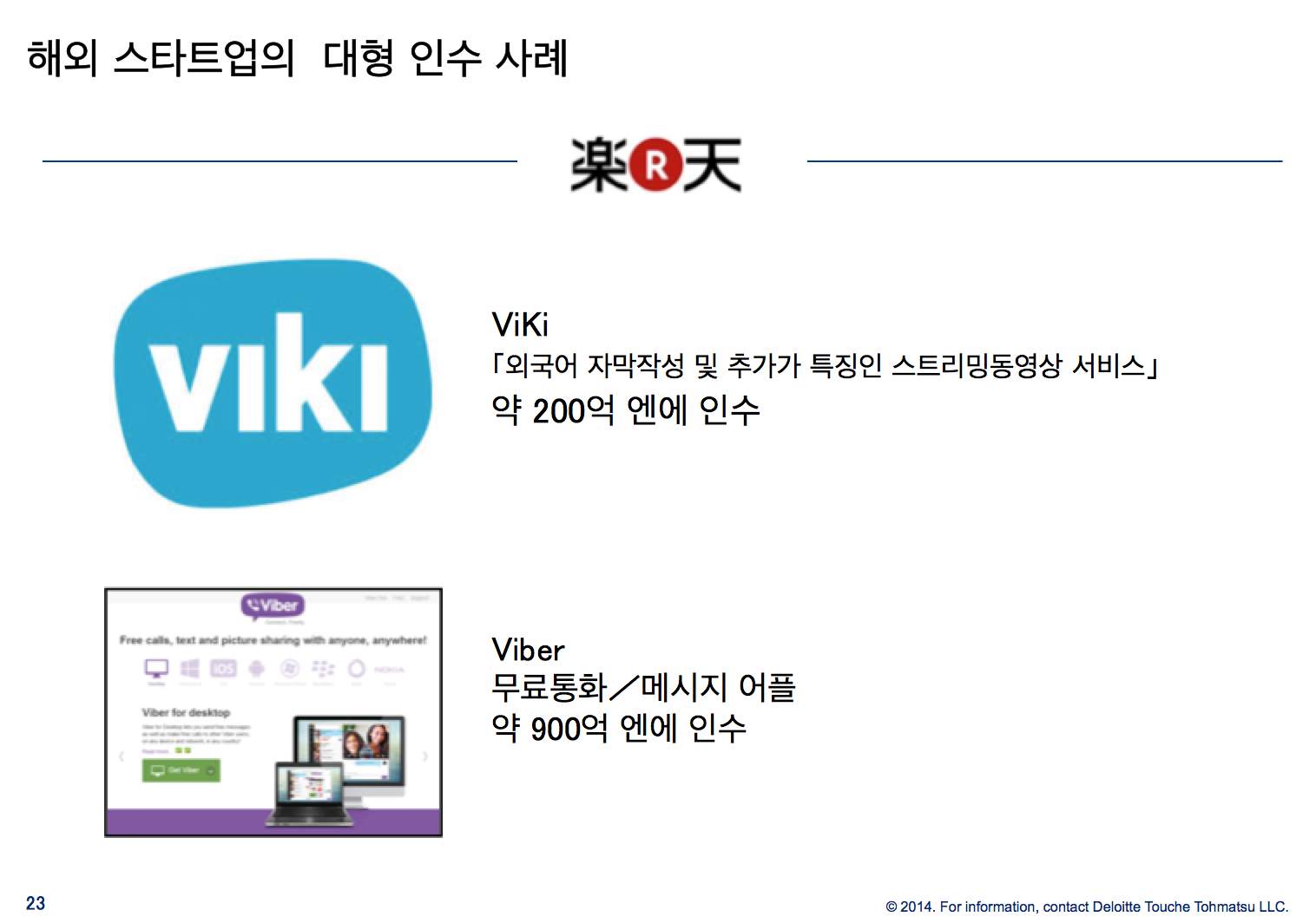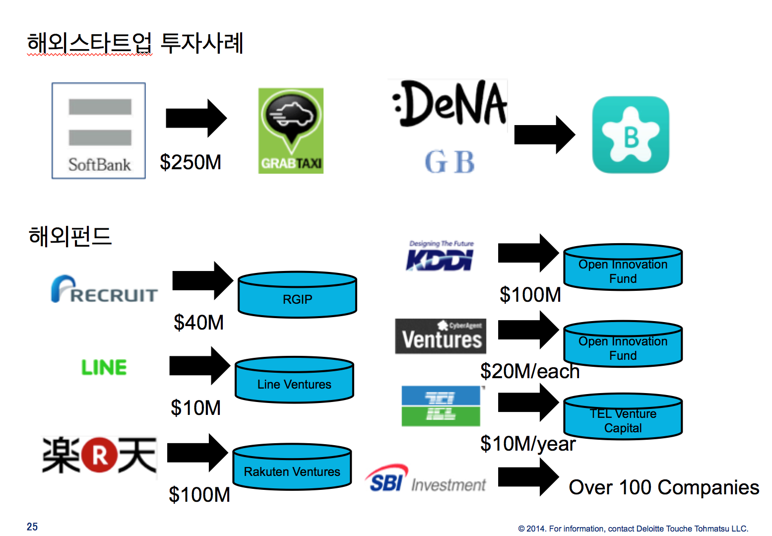 일본내의 스타트업 몸값이 너무 올라가고 투자할 스타트업의 숫자가 부족하다보니 이들은 해외에까지 적극적으로 눈을 돌리고 있다. 라쿠텐은 호창성, 문지원부부가 실리콘밸리에서 창업한 비키(ViKi)를 2013년에 약 2천억원에 인수했다.