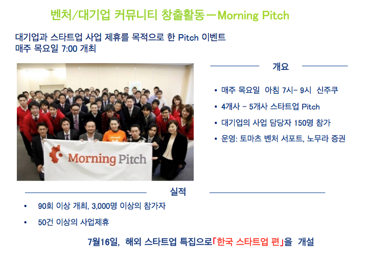 일본의 대기업들이 스타트업에 관심이 아주 많다는 것을 보여주는 단적인 예가 토마츠가 매주 개최하는 모닝피치 이벤트다. 매주 목요일 아침 7시에 도쿄 신주쿠에서 일본의 대기업 신규사업담당자 150명이 모여서 스타트업 4~5개사의 발표를 듣고 열띤 질문을 던진다. 지금까지 90회이상 개최됐고 50건이상의 사업제휴가 이뤄졌다. 이번 7월16일에는 한국의 스타트업 2팀이 참가할 예정이기도 하다.