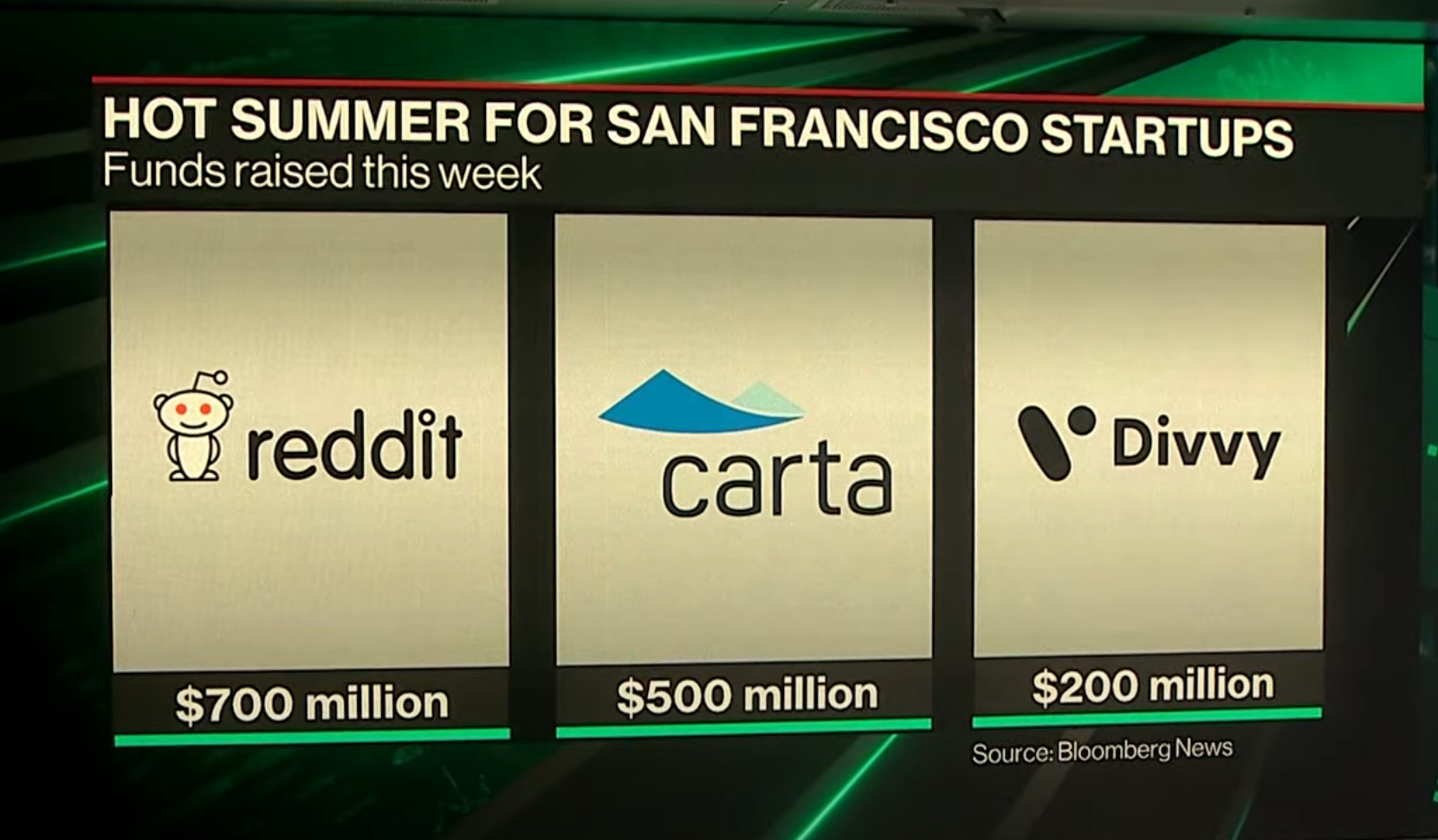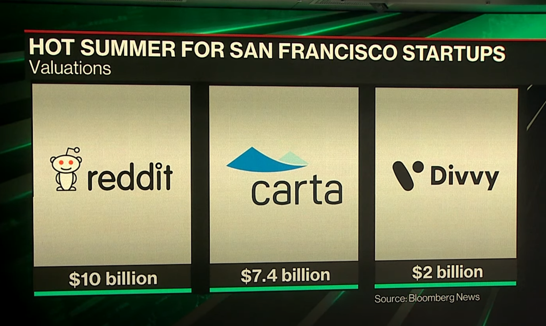 소셜 뉴스 커뮤니티를 운영하는 레딧이 7억불을 펀딩했다. 약 8천억원쯤의 거액인데 이 펀딩으로 레딧의 밸류에이션은 10B이 됐다. 약 11조원+다. 비상장 기업의 캡테이블 관리, 주주명부 관리 등을 도와주는 플랫폼인 카르타도 5억불을 펀딩했고 밸류에이션은 7.4B이 됐다. Rent-to-Own이라는 독특한 모델을 가진 디비홈 Divvy도 2억불을 펀딩하며 밸류에이션도 2B이 됐다.