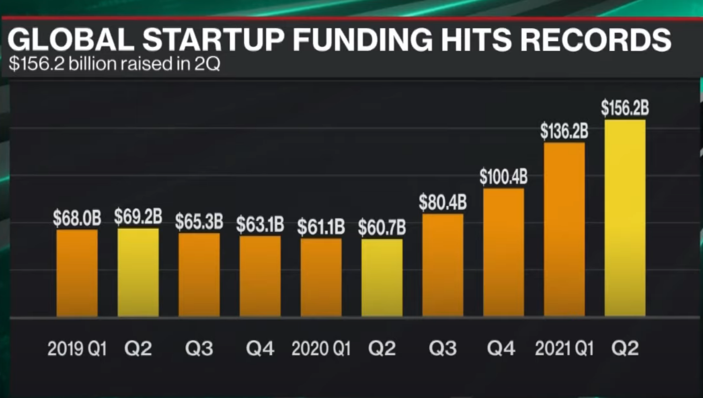 이런 스타트업의 엄청난 거액 펀딩과 밸류 급등은 전세계적인 현상이다. 한국도 마찬가지다. 위는 CB인사이츠가 집계한 글로벌 스타트업펀딩 통계인데 지난 2분기에만 무려 156B이 스타트업에 투자됐다고 한다.