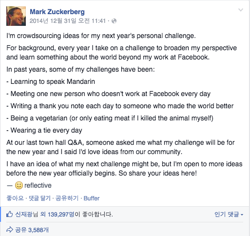 새해에 새로 개인적으로 도전할 거리를 페이스북에 물어보는 소위 아이디어 크라우드소싱을 하는 마크 저커버그의 모습에 신선한 자극을 받았다. 역시 대단한 그릇이다. 페이스북을 상장시켜 약 240조원 기업가치의 회사로 만들고 본인은 약 36조원의 재산을 가진 자산가이면서도 이런 새로운 배움과 도전을 게을리하지 않는다는 것이 놀랍다.