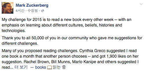 마크 저커버그의 새해 도전과제 – 2주에 한권씩 새로운 책 읽기