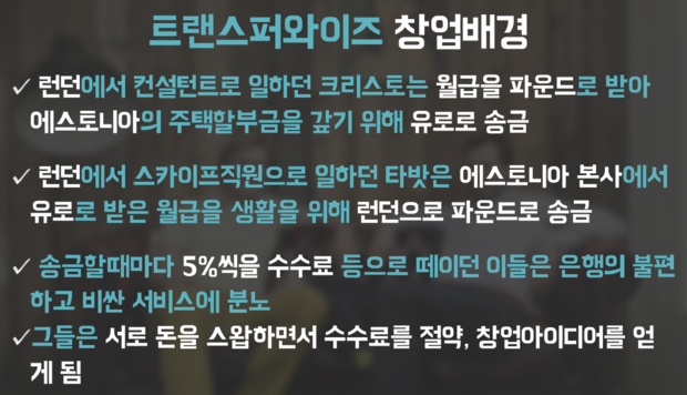 에스토니아출신으로 영국 런던에서 일하던 타밧과 크리스토는 비싼 환전수수료때문에 불만이 많았다. 에스토니아에서 나온 인터넷전화서비스인 스카이프의 첫번째 직원이었던 타밧은 런던에 파견되서 일하고 있었다. 그런데 월급은 에스토니아에서 유로로 받았기 때문에 런던에서의 생활을 위해 매번 돈을 파운드로 환전해 런던으로 송금받았다. 반면 런던에서 컨설턴트로 일하고 있던 크리스토는 매달 에스토니아에서 구입한 주택의 할부금을 갚기 위해 런던에서 파운드로 받은 월급을 유로로 환전해 에스토니아로 보내고 있었다. 그들은 은행의 불편한 송금절차와 송금금액의 거의 5%에 이르는 비싼 수수료에 신음했다.