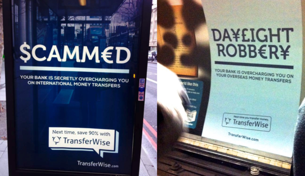 이들은 광고도 공격적이다. 런던시내의 위와 같은 가두 광고에서 “당신이 거래하는 은행은 국제송금에서 몰래 바가지를 씌우고 있습니다. 당신은 속고 있습니다. 당신은 백주강도를 당하는 셈입니다. 다음부터는 트랜스퍼와이즈를 이용해 90%의 수수료를 절약하십시오”라는 식으로 마케팅한다.