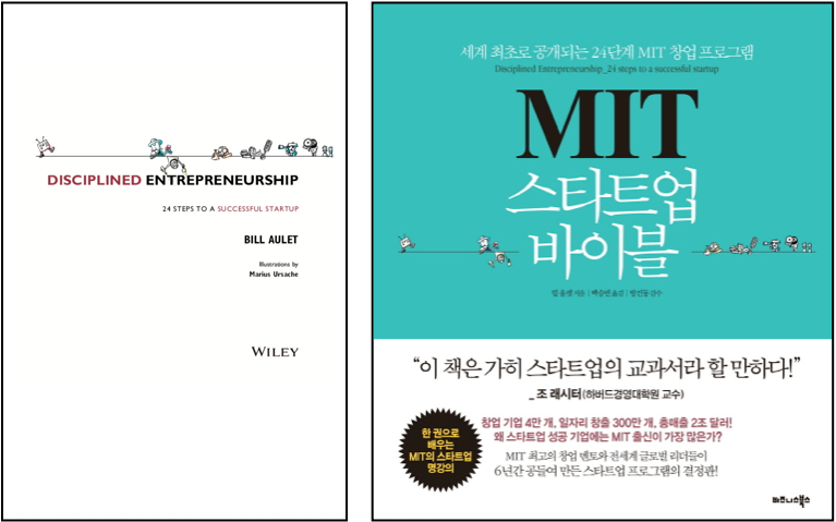 MIT스타트업바이블의 원제는 ‘Disciplined Entrepreneurship’이다. 굳이 번역하자면 ‘잘 훈련된 창업가정신’이라고 해야 할까. 창업해서 회사를 키워가는 과정을 잘 정돈해서 가르쳐주는 책이라고 할 수 있을 것 같다. 그런데 책 표지에는 MIT라는 말이 어디에도 없는데 한국판역서에는 대문짝만하게 ‘MIT’라고 박혀서 나왔다. 저자 이름보다도 크게 추천글을 쓴 교수의 이름이 나와있는데 하버드교수다. 물론 책의 내용에는 MIT창업센터의 센터장인 빌 올렛씨가 MIT에서 경험한 내용이 많이 나와있기는 하다.