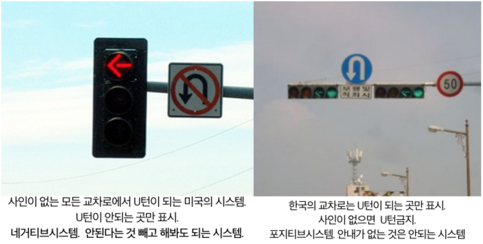 미국의 도로에서는 아무 교차로에서나 유턴을 할 수 있도록 되어 있다. 유턴을 할 수 없는 곳에만 금지표시가 되어 있다. 규제시스템도 비슷하다. 안되는 것(Negative)만 표시해놓고 규제대상으로 표시되어 있지 않은 것은 자유롭게 해봐도 되는 시스템이다. 그렇기 때문에 규제를 아랑곳하지 않고 새로운 분야에서 도전을 하는 기업이 많이 나온다.