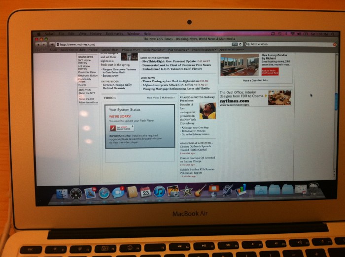 그런데 아쉽게도 맥북에어 사파리에는 플래쉬플래이어가 설치되어 있지 않았다! 예전 맥북에서는 기본으로 설치되어 있었기에 애플의 처사에 약간 실망(?)하고 어도비홈페이지에서 바로 다운받아 설치하려고 했지만 컴퓨터패스워드를 알아야 설치할 수 있기 때문에 동영상을 볼수가 없었다. 아이패드로 접속했을 때는 웹사이트들이 자동으로 HTML5로 동영상을 전환해서 보여주기 때문에 문제가 없지만 맥북에어에서는 모두 플래쉬동영상으로 보여주기 때문에 애플홈페이지에 있는 동영상을 제외하고는 어느 사이트에서도 동영상을 볼 수가 없었다.(물론 찾아보면 방법이 있겠지만 1분내에 알아낼 수 있는 것이 아니기 때문에)